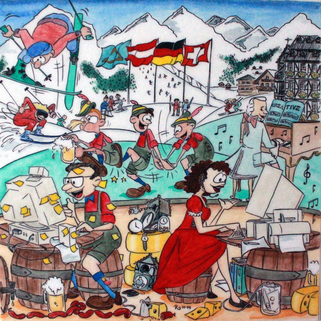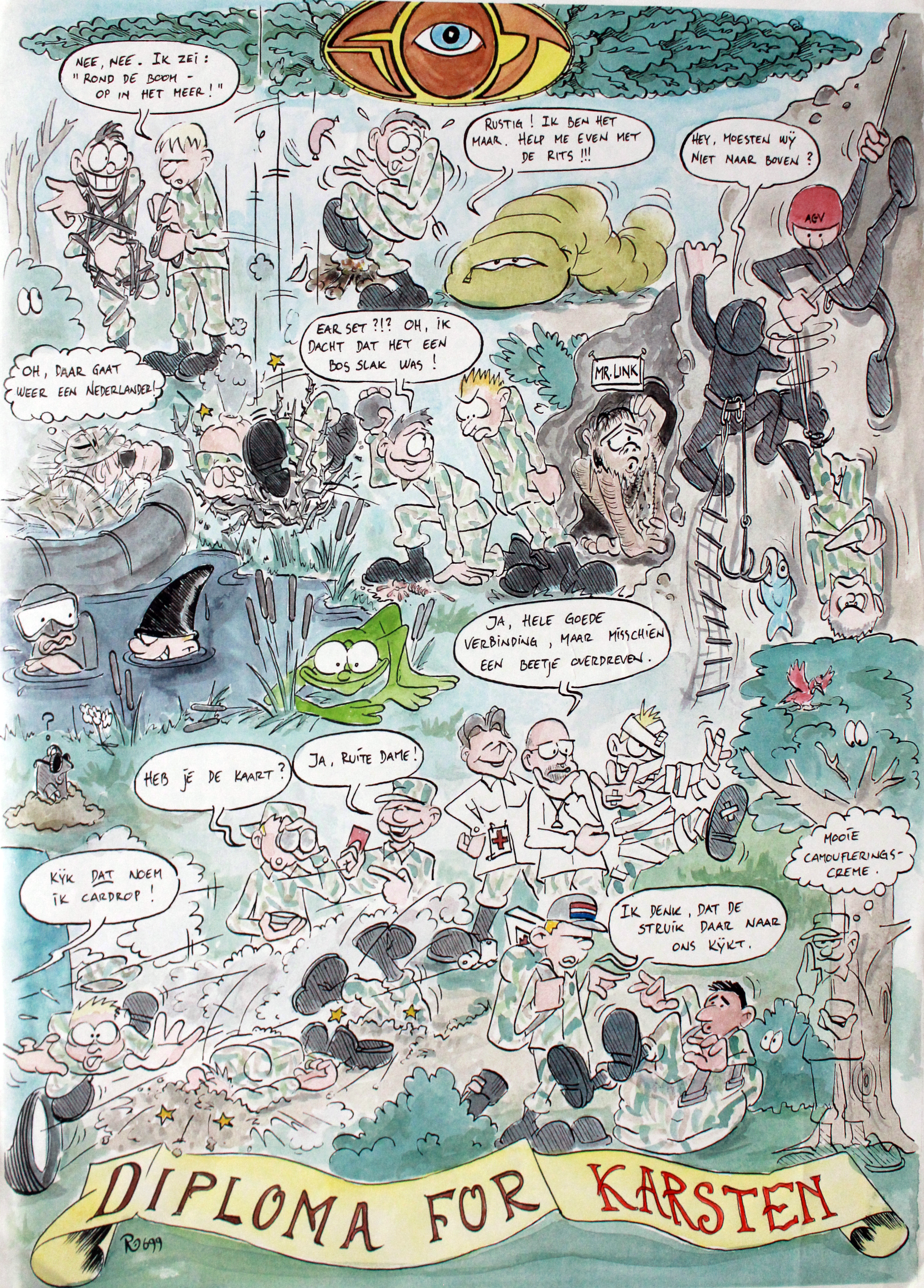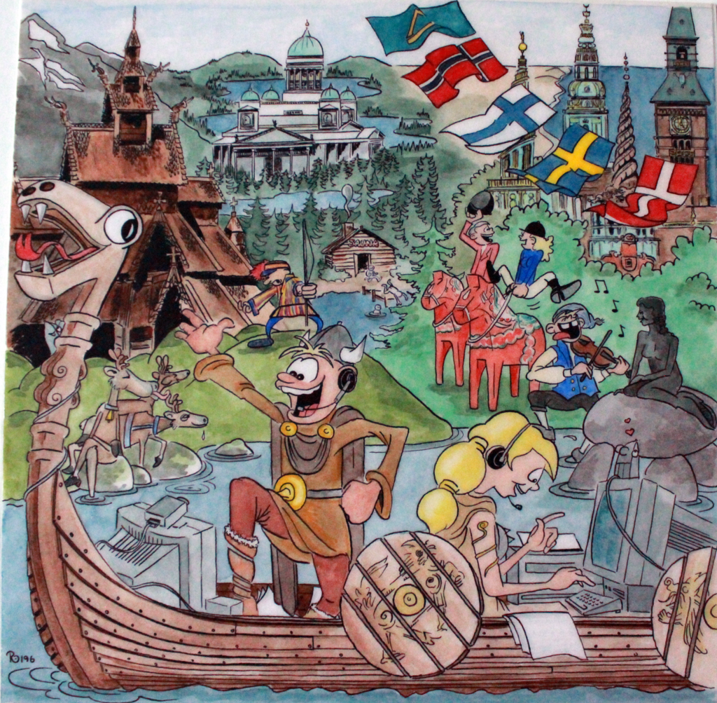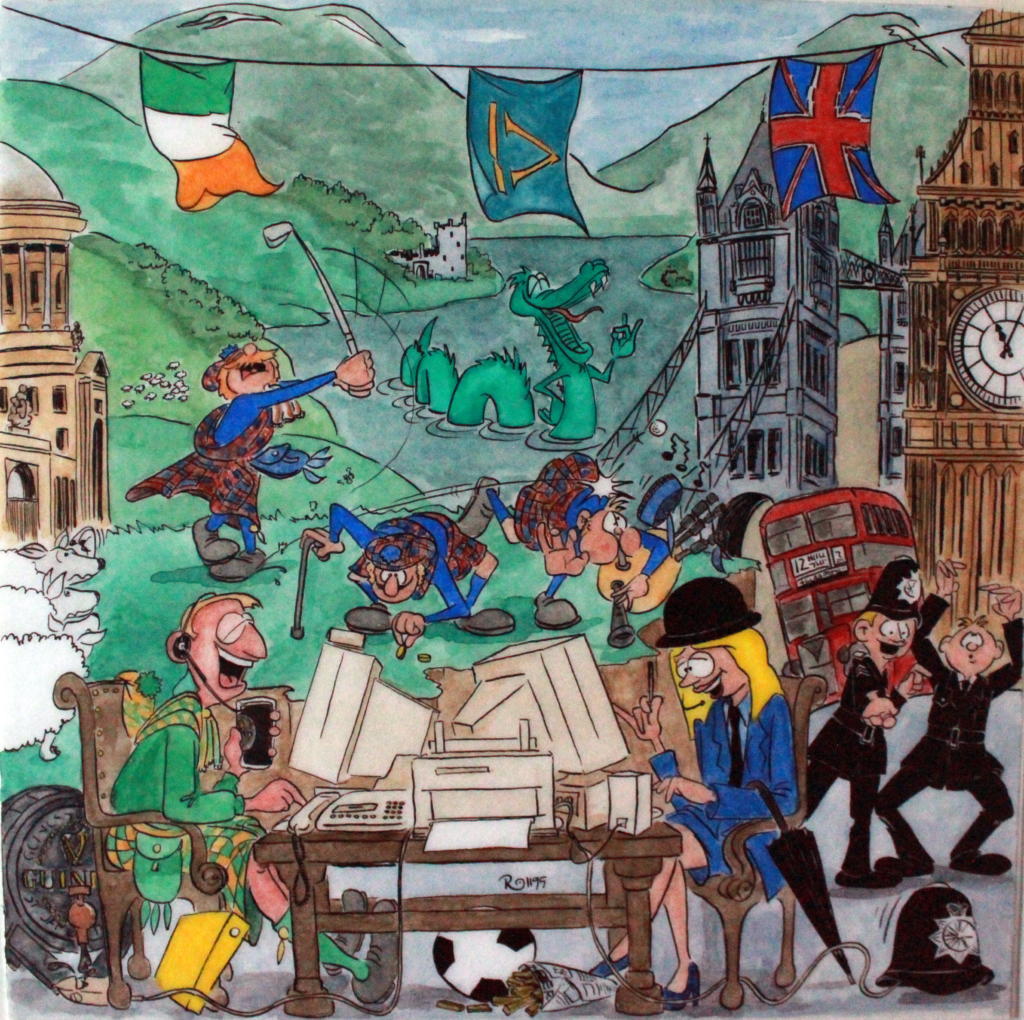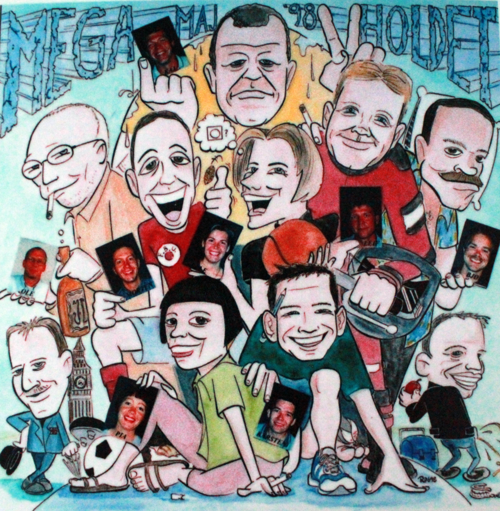 Akvarel er en populær malerteknik, og umiddelbart henledes tankerne på på bl.a. bybilleder og romantiske landskabsmalerier. Sådanne malerier laver jeg selvfølgelig, men ofte bruges akvarel i min verden “blot” som farvelægning i forbindelse med karikaturer, tegneseriestriber osv. En akvareltegning fra min hånd er lavet på tykt papir – først blyant, så farvelægning og sidst optegnet med tusch, og hele tiden med fokus på de små detaljer.