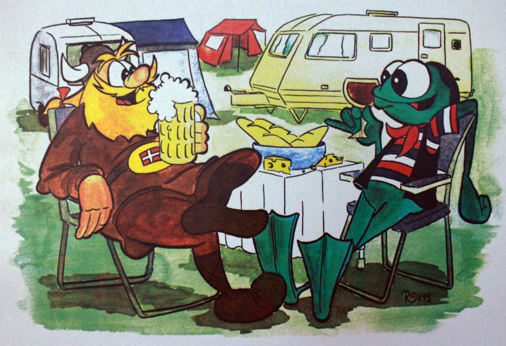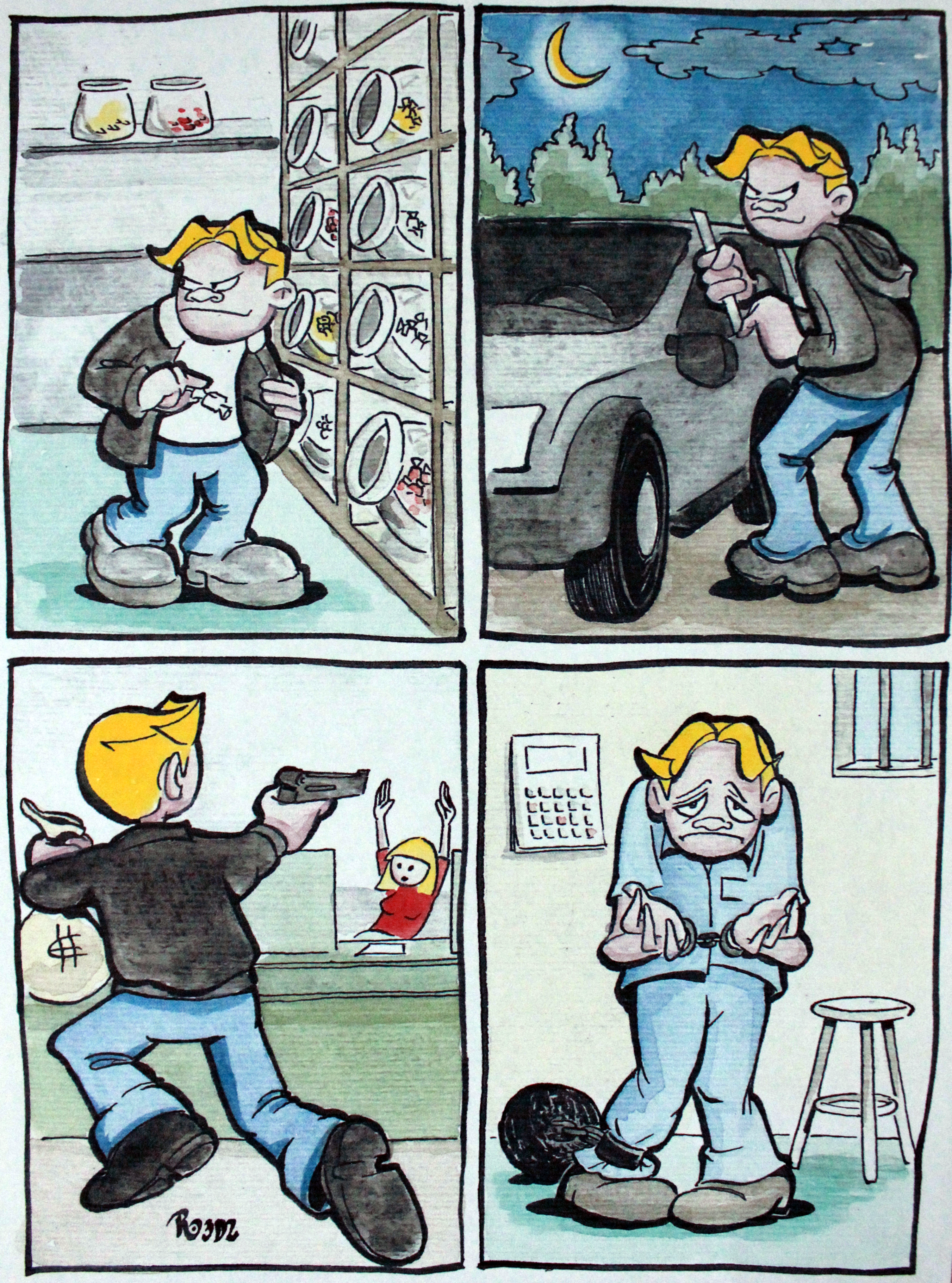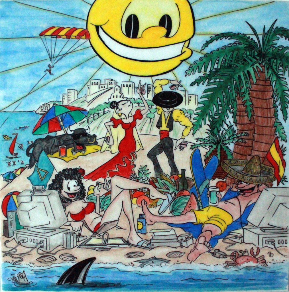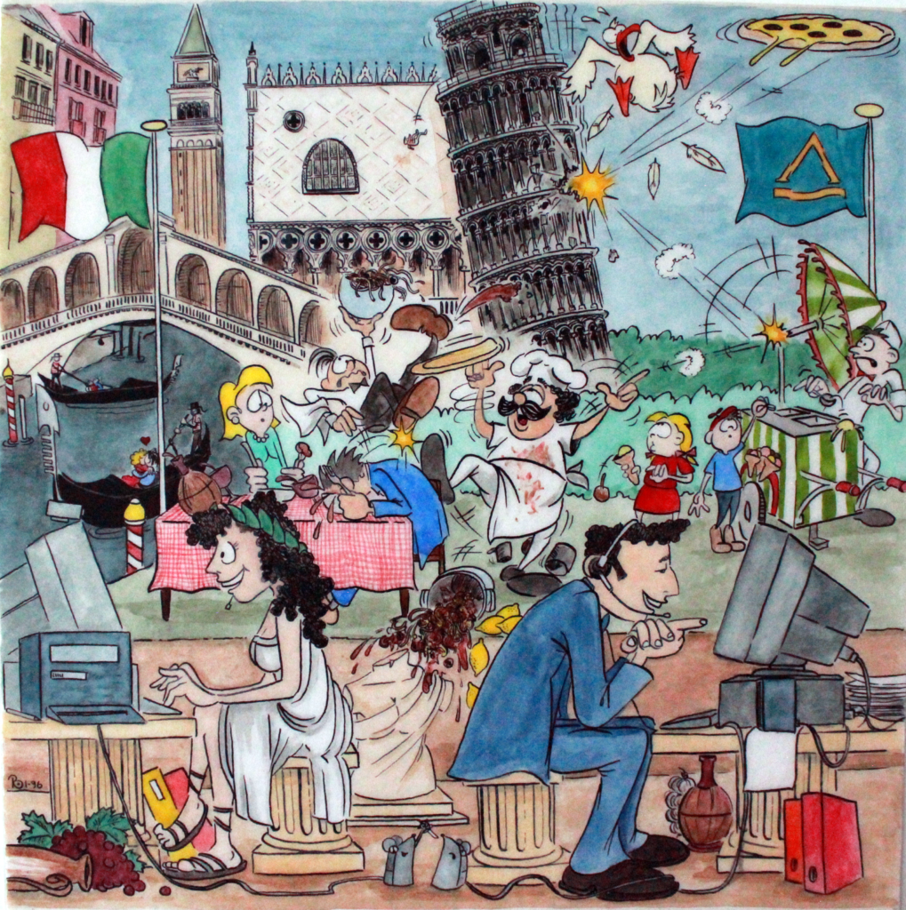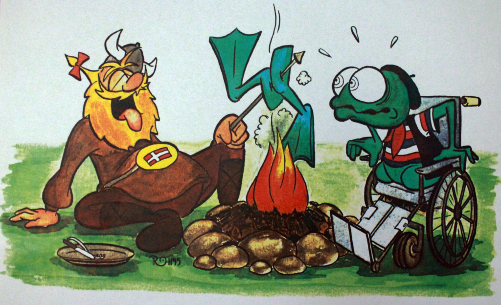Akvarel er en populær malerteknik, og umiddelbart henledes tankerne på på bl.a. bybilleder og romantiske landskabsmalerier. Sådanne malerier laver jeg selvfølgelig, men ofte bruges akvarel i min verden “blot” som farvelægning i forbindelse med karikaturer, tegneseriestriber osv. En akvareltegning fra min hånd er lavet på tykt papir – først blyant, så farvelægning og sidst optegnet med tusch, og hele tiden med fokus på de små detaljer.
